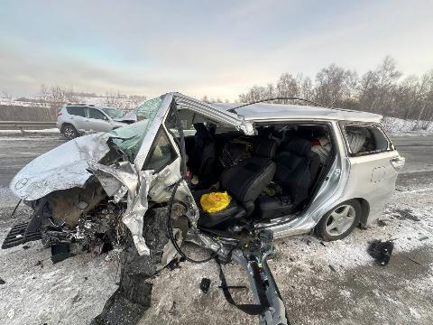 По данным дорожной полиции региона, 56-летний водитель автомобиля "Тойота Виш", двигаясь со стороны Красноярска, выехал на полосу встречного движения и врезался в кроссовер "Тойота РАВ4" под управлением 49-летнего мужчины.