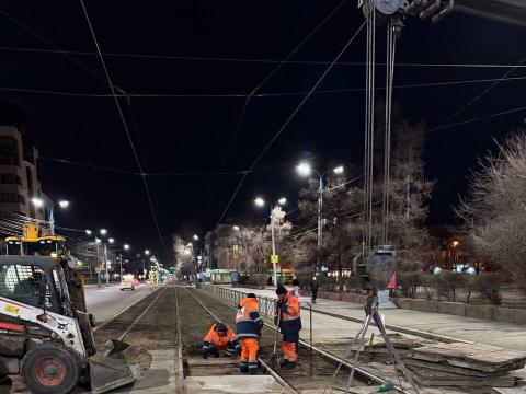 В ночное время специалисты МУП «Иркутскавтодор» занимаются заменой изношенного основания на перекрестках, где проходят трамвайные пути. Вместо резинового и асфальтового покрытия используются бетонные плиты. В настоящее время такие работы проводятся на улице Декабрьских Событий.