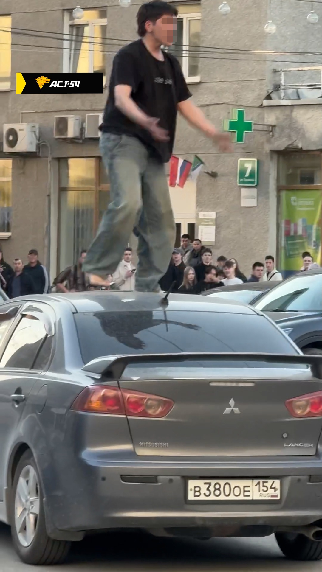 В четверг вечером в Новосибирске на Красном проспекте у площади Ленина неадекват прыгал на крышах припаркованных на платной парковке автомобилей, при этом громко матерясь на виду у всех прохожих.