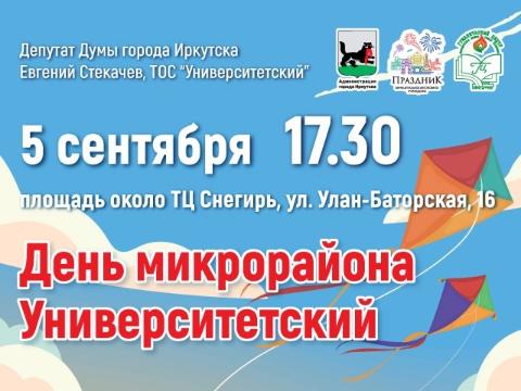 5 сентября в 17:30 возле ТЦ «Снегирь» (Университетский, 16) состоится День Университетского. Гостей ждет концерт с участием творческих коллективов и чествование активных жителей. Евгений Стекачев, председатель думы Иркутска и депутат по округу №28, отметил, что такие мероприятия становятся хорошим поводом для соседей встретиться и провести время в дружеской атмосфере.