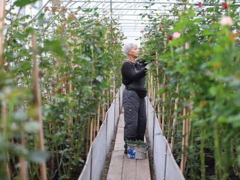 Ещё одна теплица используется для выращивания роз. В ней насчитывается более полутора тысяч кустов. На предприятии рассказали, что в прошлом году закупили новые сорта — «Родас», «Керио», «Аква», «Анастасия», «Боинг» и другие. Сотрудники регулярно проводят обрезку и формовку кустов, благодаря чему стебли становятся более крепкими и высокими. В этом сезоне теплицу переводят на круглогодичный режим: срезка роз продолжится даже зимой.