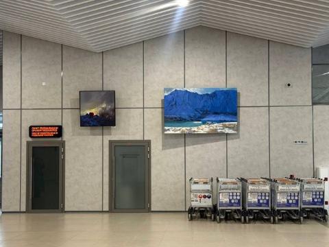 Центральным экспонатом выставки стало шестиметровое полотно, изображающее зимний Байкал. Оно размещено в зоне, где встречают прибывших пассажиров. Остальные работы художника можно увидеть в зоне выдачи багажа.