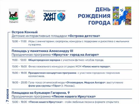 7 июня в Иркутске состоятся праздничные мероприятия, посвященные 364-летию города. Основные торжества пройдут в сквере имени Кирова, у памятника Александру III и в здании на бульваре Гагарина, 9.