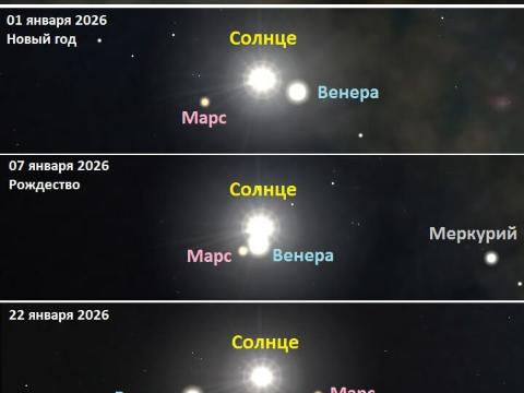 В рождественскую ночь выстраивание станет максимально плотным: Венера, Марс и Солнце почти сольются в одной линии, а Меркурий, догоняющий их в видимом движении, замкнет конфигурацию. Кульминация явления ожидается 22 января, когда три планеты образуют с Солнцем почти правильную ромбовидную фигуру. После этого построение начнет быстро распадаться: первым отойдет Меркурий, затем Венера и Марс.