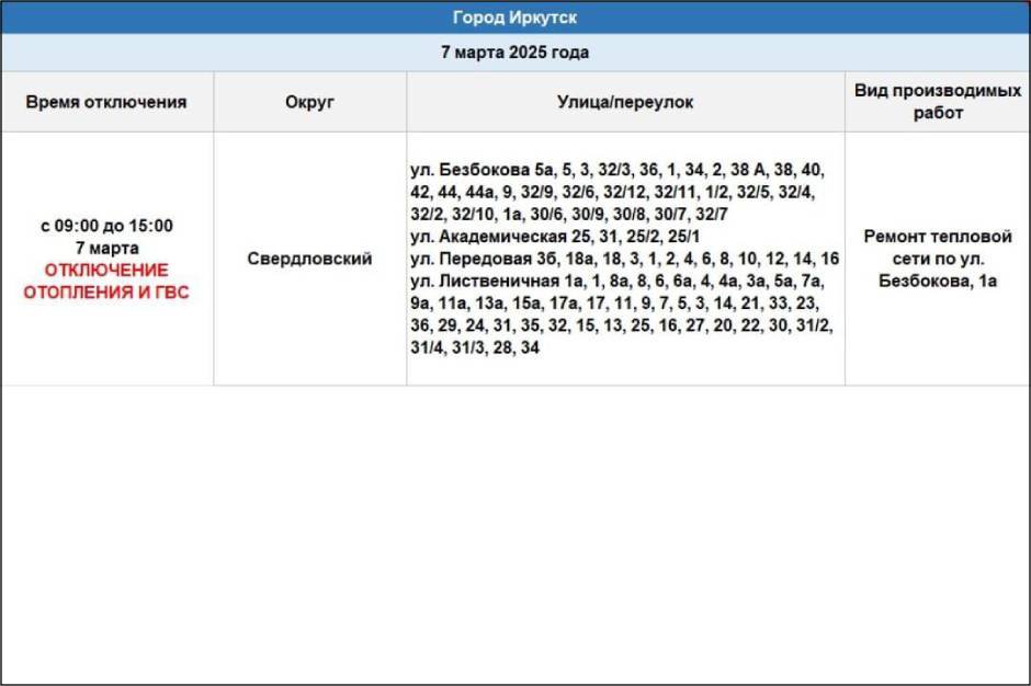 Отключение коснётся улиц Безбокова, Передовой, Лиственичной и Академической. Горячее водоснабжение и отопление будут недоступны с 09:00 до 15:00.