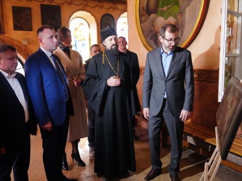 В рамках выставки парламентарии также посетили Крестовоздвиженскую церковь, где оригинал картины хранится уже более 200 лет. Экскурсию провел протоиерей Павел Телегин, настоятель храма. В церкви находятся уникальные священные реликвии 17-18 веков. Депутаты осмотрели реставрируемый придел, который планируется открыть для прихожан в этом году. Обсудили планы по изменению условий субсидирования религиозных организаций. Эти средства выделяются на работы по сохранению объектов культурного наследия, находящихся в собственности учреждений.