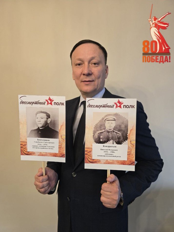 Саидбаддал Саидгареевич Бектемиров и Николай Федорович Кондратьев – дедушки депутата по избирательному округу № 8 Артура Бектемирова. Саидбаддал Саидгареевич родился в 1916 году. С ноября 1941 года по август 1944 года в составе 212 артиллерийского полка участвовал в Великой Отечественной войне. Был командиром отделения в звании сержанта. Награжден медалями «За отвагу», «За победу над Германией в Великой Отечественной войне 1941-1945 гг.» и двумя Орденами Красной Звезды. Николай Федорович родился в 1915 году. Участвовал в Великой Отечественной войне с октября 1941 года по 9 мая 1945 года. Прошел путь от командира пулеметного расчета до командира пулеметной роты. Звание – лейтенант. Награжден Орденом Красной Звезды, медалью «За победу над Германией в Великой Отечественной войне 1941-1945 гг.».