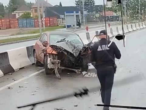 В Новосибирске на Мочищенском шоссе из красного седана на проезжую часть выбросило человека — перед этим автомобиль столкнулся с фонарным столбом.