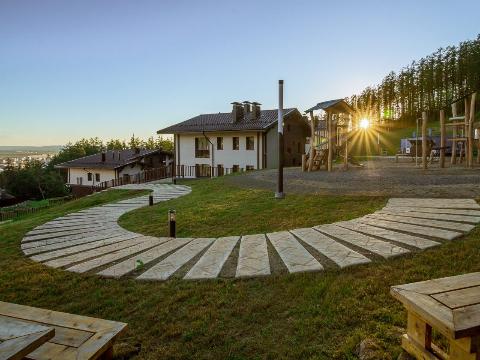 Это скорее не просто гостиница, а замкнутое пространство с коттеджами в альпийском стиле, клубным домом, рестораном, конференц-зоной и детскими площадками. Всё сделано с прицелом на универсальность — чтобы можно было жить, отдыхать, встречаться, работать, кататься и просто смотреть на горы, не выходя за пределы локации.