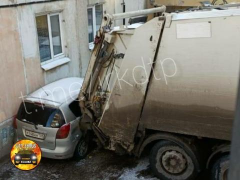 Накануне необычное ДТП произошло с участием мусоровоза возле жилого дома на бульваре Рябикова в Иркутске. Как сообщают очевидцы, грузовик-мусоровоз скатился с обледенелой горки и задом наехала на припаркованный у жилой пятиэтажки легковой автомобиль. В результате легковушка была буквально вмята в стену дома. К счастью никто из людей не пострадал.