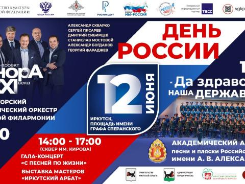 Главный концерт пройдет на площади графа Сперанского. С 17:00 до 18:30 выступит Губернаторский симфонический оркестр Иркутской областной филармонии и солисты арт-проекта «Тенора XXI века». В 19:00 на сцену выйдет Академический ансамбль песни и пляски Российской армии имени А. В. Александрова с программой «Да здравствует наша Держава!».