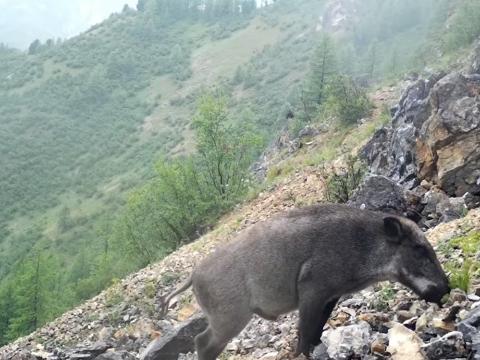 В фотоловушку Тункинского национального парка попал милый кабанчик. На видео он с большим интересом ест свежую зелень с корнями.
