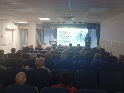 Департамент здравоохранения и социальной помощи населению администрации Иркутска, в рамках городского проекта "Активное долголетие", организовал в культурно-досуговом центре "Марат" открытую лекцию "Профилактика развития когнитивных расстройств". Слушателями стали более 80 иркутян старшего поколения, а саму лекцию прочитали главный врач Областного гериатрического центра Жанна Капустенская и невролог того же медучреждения Наталья Бреева.