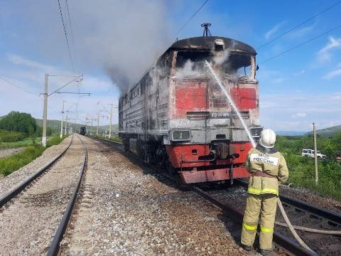 По данным спасательного ведомства, огонь повредил кабину и двигательный отсек тепловоза на площади 15 квадратных метров.