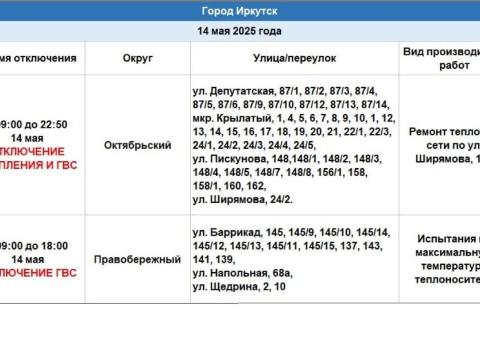 С 14 мая в некоторых домах Октябрьского и Правобережного округов Иркутска будет временно отключено отопление. Это связано с проведением ремонтных работ на тепловых сетях.