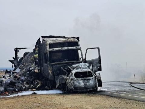 На кадрах с места происшествия видно, что после столкновения фура загорелась.