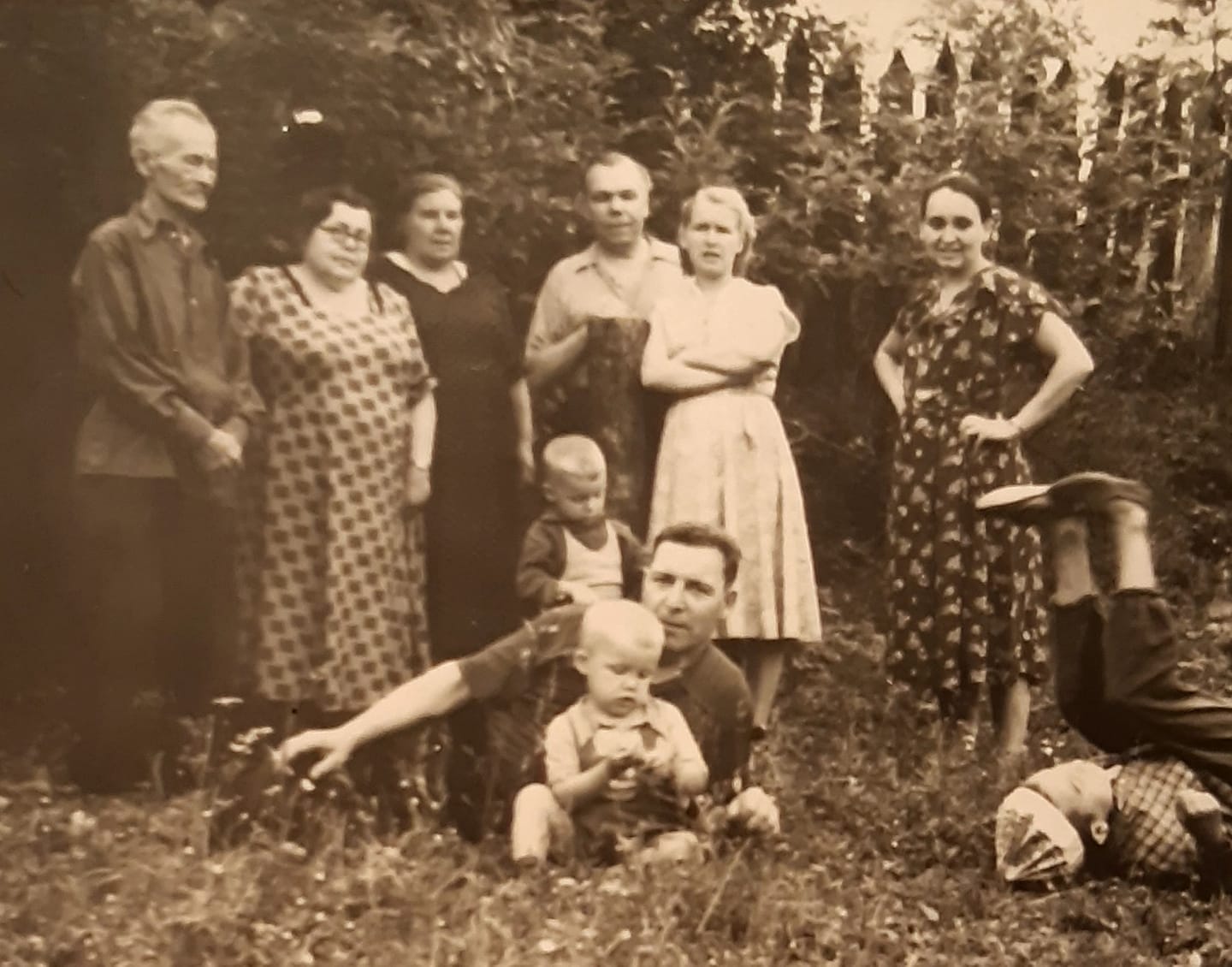 На второй фотографии изображен сад на нашем участке. Заросли, цветущей черёмухи, опьяняли ароматом в начале лета и гнулись под тяжестью гроздей ягод в августе. Мои губы были постоянно черны от ягодного сока. Около деревьев росла картошка. Рядом с посадками, на подстилке, лежали книги. Работая в огороде, я делал перерывы на чтение, во время которого объедался черёмухой. На снимке я между трудовой деятельностью и отдыхом.