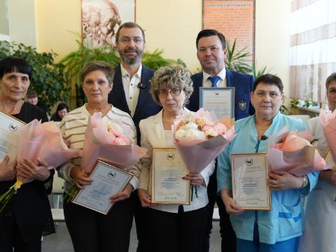 Так, за многолетний труд, высокие достижения в профессиональной деятельности и существенный вклад в развитие здравоохранения награды вручили врачу-терапевту Елене Андрияновой, санитарке травматологического отделения Наталье Волковой, фельдшеру Елене Кожевниковой, рентгенолаборанту Жанне Кондратьевой и медсестре Виктории Прокопьевой.