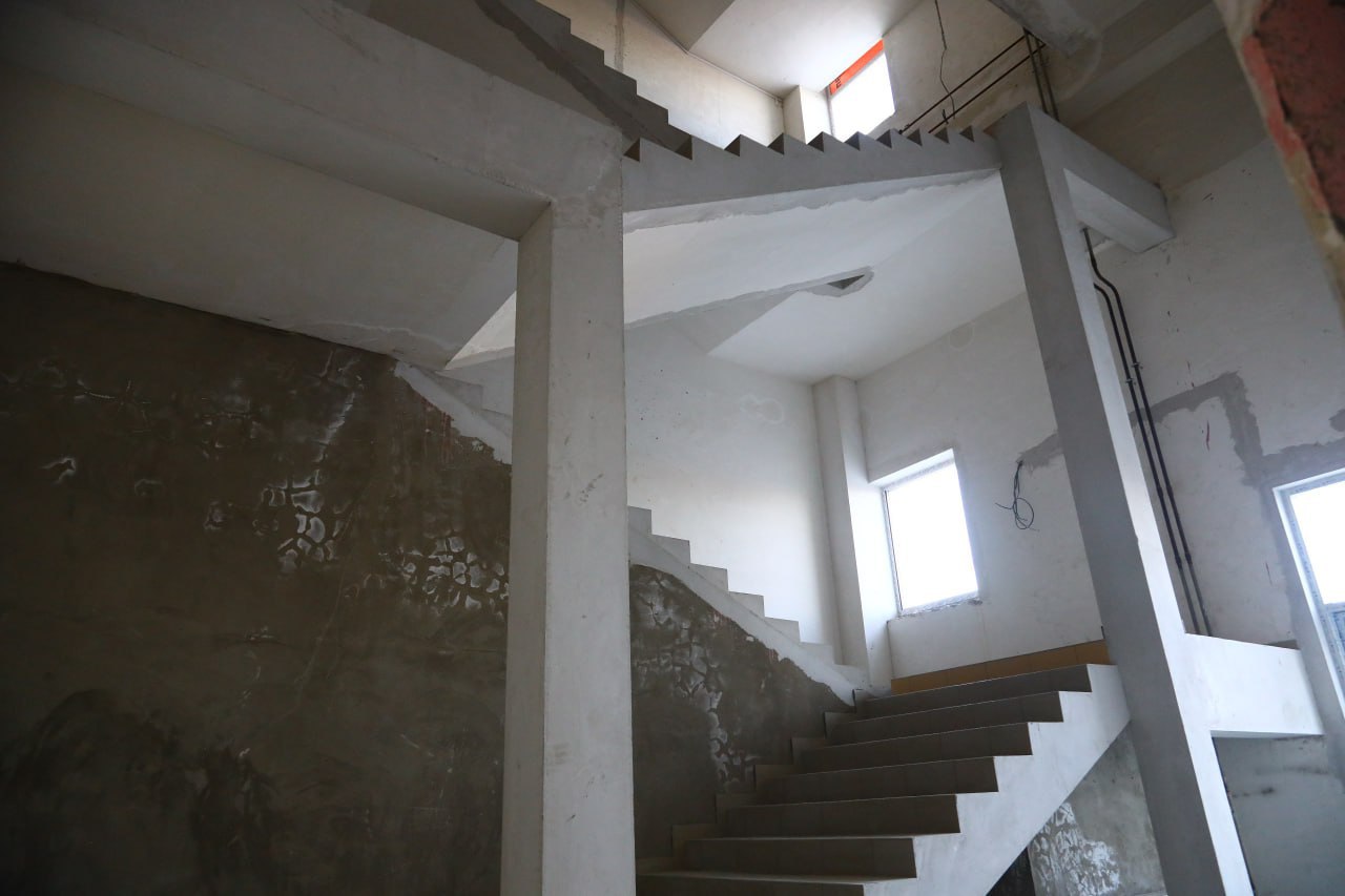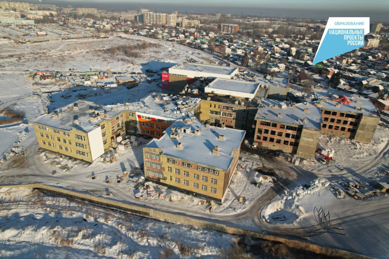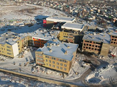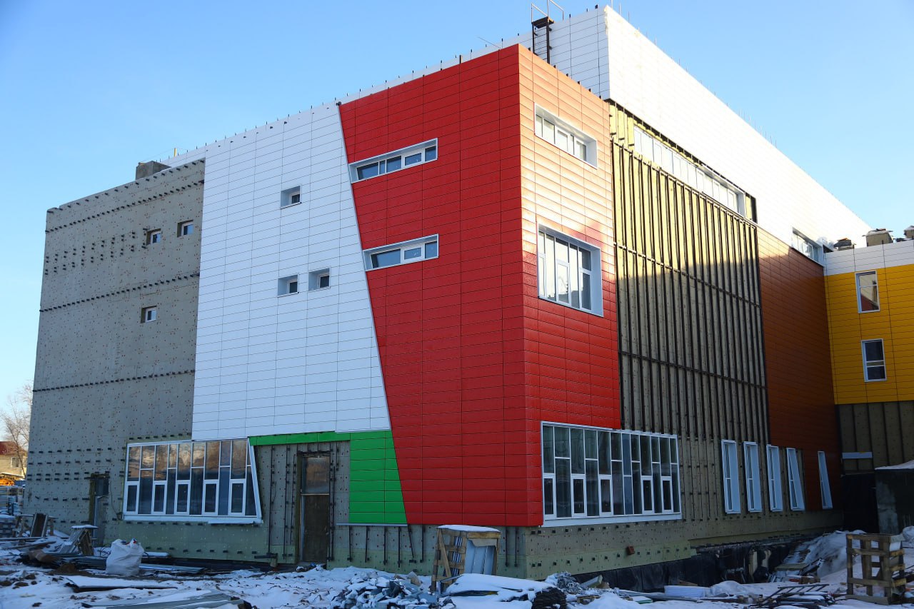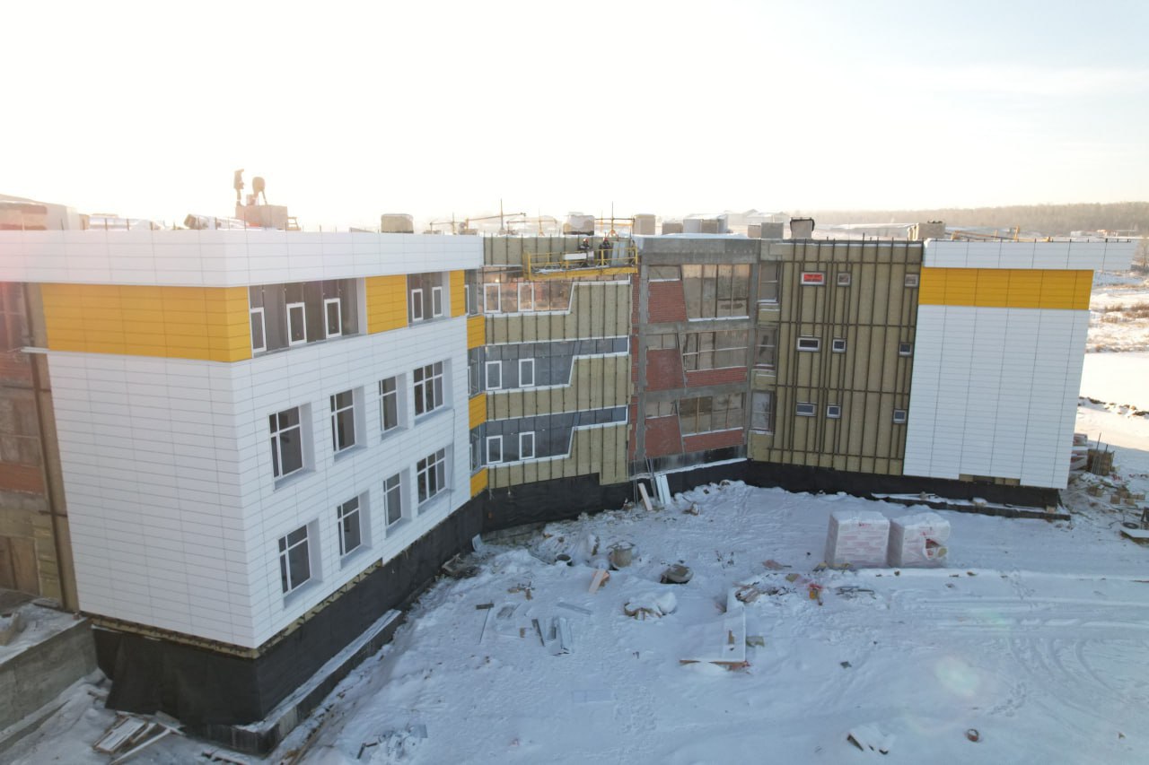 К настоящему моменту построены уже все девять блоков школьного комплекса, восемь из которых закрыты кровлей, а шесть даже подключены к отоплению. Полным ходом идут работы по монтажу системы вентиляции и оконных блоков, утеплению фасадов и отделке внутренних помещений.