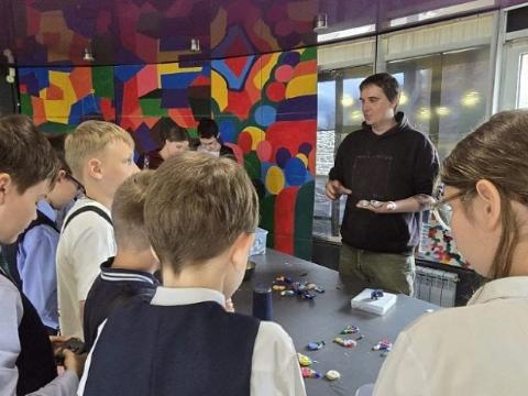 Авторы проекта, Дмитрий Темников и Валерия Шафирова, рассказали школьникам о том, как была создана лаборатория, а также о процессе переработки вторсырья и изготовлении различных предметов.