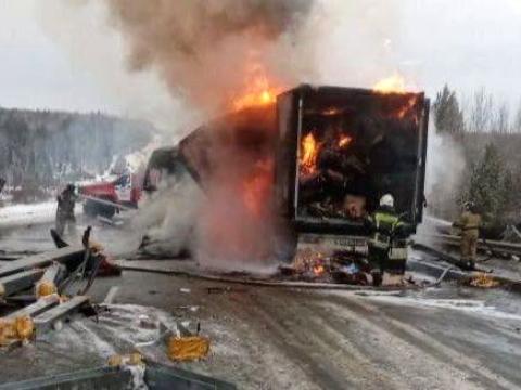 После столкновения грузовики загорелись, два из трех водителей большегруза погибли, третьего госпитализировали.
