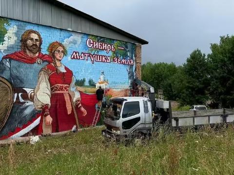 На нём изображён могучий богатырь и улыбающаяся девушка на фоне синего неба с берёзовыми ветвями и полевыми цветами. Эта картина заменит надпись, которую ранее здесь создал местный художник Андрей Артемьев: «Русский — значит трезвый».