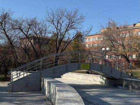 В мэрии уточнили, что подрядчик демонтировал плиточное покрытие, зачистил поверхности от старого клея, загрунтовал фонтан и мостик, провел гидроизоляцию чаши, уложил плитку и укрепил поручни. Кроме того, он установил противоскользящие плинтусы на ступени и поверхности мостика.