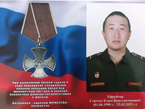 Ефрейтор Клим Сергеев, уроженец Нукутского района, посмертно удостоен ордена Мужества за проявленный героизм в ходе специальной военной операции. Он погиб в феврале 2025 года в Харьковской области в результате миномётного обстрела.Об этом сообщили в администрации района.