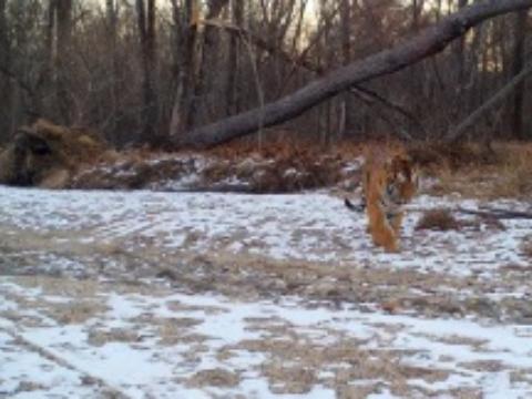 На кадрах видно, как хищник внезапно появился в темноте. Он стоял на снегу, глядя в камеру.