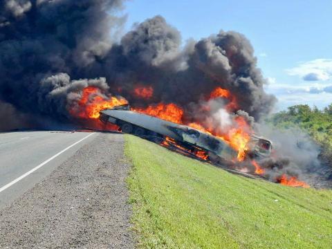 В субботу, 19 июля, на 563-м километре федеральной трассы Тюмень - Омск столкнулись два большегруза. Удар был такой силы, что большегрузы развернуло и они перекрыли дорогу, а один из них загорелся.