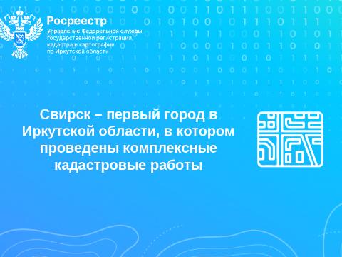 Кроме Свирска в реестр недвижимости были внесены границы объектов недвижимости еще по нескольким кадастровым кварталам Иркутского района. Итого на сегодня внесены результаты кадастровых работ по 14 кадастровым кварталам в отношение 1640 объектов недвижимости.