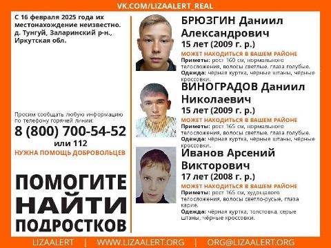 Согласно ориентировки на мальчиков, которую распространил отряд "Лиза Алерт", пятнадцатилетние Даниил Брюзгин и Даниил Виноградов, а также семнадцатилетний Арсений Иванов еще 16 февраля пропали в деревне Тунгуй Заларинского района Иркутской области. С тех пор об их местонахождении ничего неизвестно.