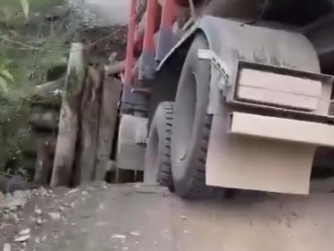 Грузовик, перевозивший древесину, проезжал по мосту, когда внезапно часть дорожного покрытия провалилась.