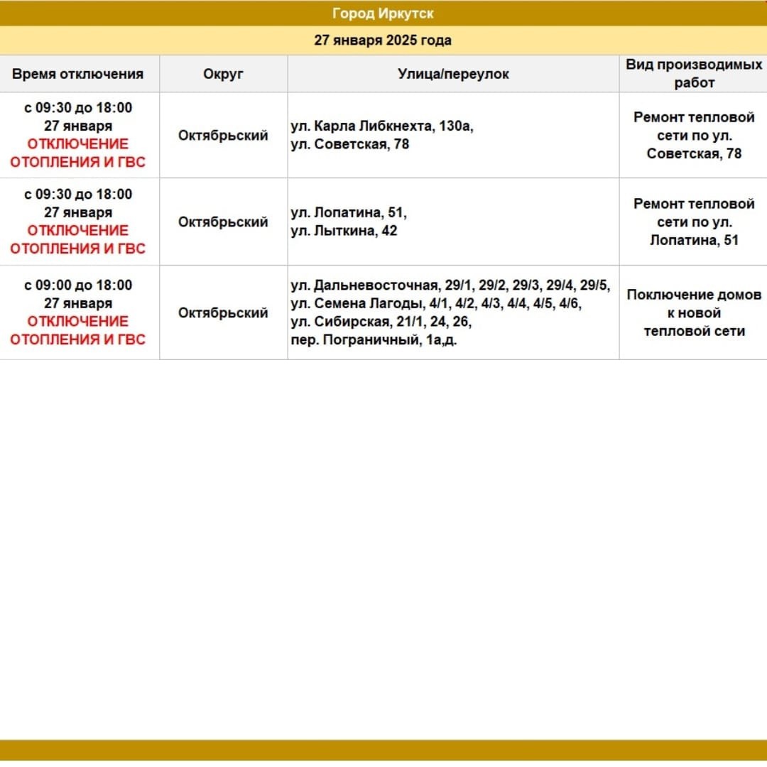 В понедельник, 27 января, в некоторых домах Октябрьского района Иркутска временно не будет отопления и горячей воды. Это связано с ремонтными работами на теплосети, которые проводятся для предотвращения возможных аварий. Об этом сообщает Оператор теплосетей Иркутска в своём Telegram-канале.