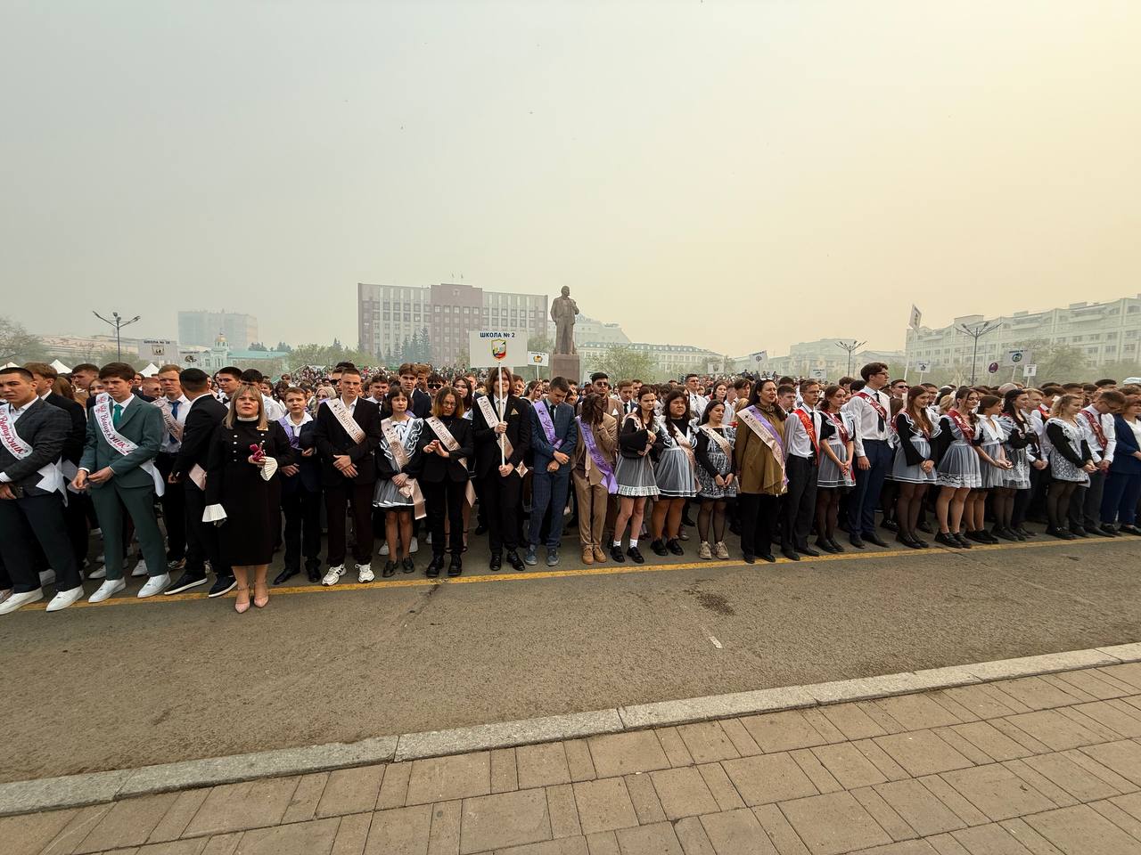 В этом году последний звонок для более полутора тысяч одиннадцатиклассников, собравшихся в субботу, 24 мая, утром на площади Ленина в Чите, прошел буквально в "особой атмосфере". Столица Забайкалья погружена в дым от самых сильных и масштабных в России лесных пожаров, бушующих вокруг уже третий месяц. Тем не менее, прощание со школой для выпускников взрослые организовали в торжественной обстановке и в рамках празднования Дня города в Чите.