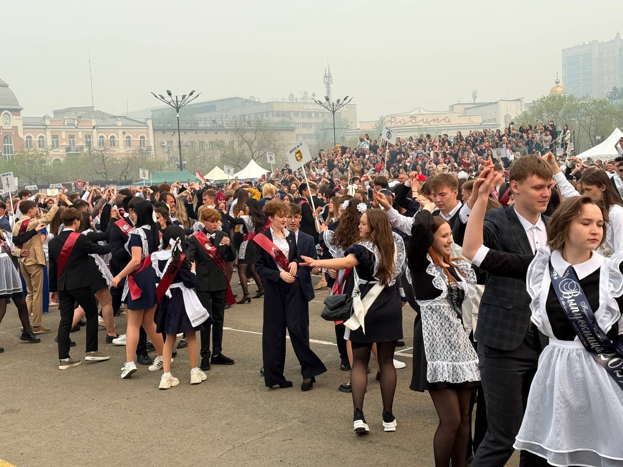 Традиционный вальс читинских выпускников в этом году был посвящен 80-летию Великой Победы. Сначала на сцене юные горожане станцевали вальс в военной форме времён Великой Отечественной войны, после чего вся главная площадь Забайкалья превратилась в танцпол. Вальс станцевали более полутора тысяч выпускников школ Читы.