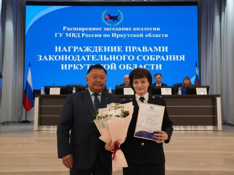 Кузьма Алдаров вручил Благодарственные письма Законодательного Собрания Иркутской области начальнику отдела полиции №6 МУ МВД РФ "Иркутское" полковнику полиции Андрею Барицкому, начальнику отдела полиции №10 МУ МВД РФ "Иркутское" полковнику полиции Кириллу Дворяку, а также сотрудникам ГУ МВД России по Иркутской области полковнику полиции Асе Горевой, полковнику юстиции Наталье Волковой, полковнику полиции Сергею Мержею, подполковнику полиции Николаю Ильину и подполковнику юстиции Ольге Сытник.