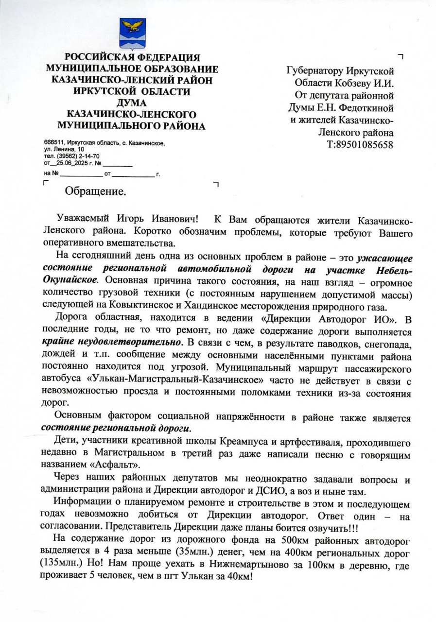 Дороги, про которые идет речь, принадлежат области. Собственник — АО «Дирекция автодорог Иркутской области». Как написано в обращении, дороги находятся в ужасном состоянии и планы по их ремонту «постоянно на согласовании». Однако из-за этого страдают местные жители. Многие пассажирские автобусы часто не выходят на линию в связи с невозможностью проезда и постоянными поломками из-за неудовлетворительного состояния дорог.