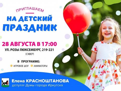 28 августа в округе №3, который представляет Елена Красноштанова, для юных горожан проведут праздник во дворе домов №219–221 на улице Розы Люксембург. Детей ждут игровое шоу и выступления аниматоров. Начало программы — в 17:00.