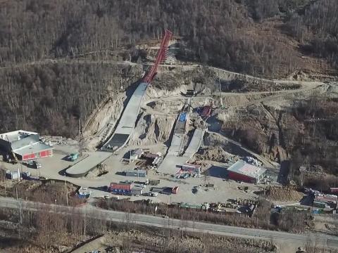 А зимой на конструкцию кладут сетку, которая формирует естественное покрытие из снега. Финишное покрытие в зоне выката собираются монтировать на самый большой из трех новых трамплинов К-60, для этого на площадку прибыла строительная бригада.