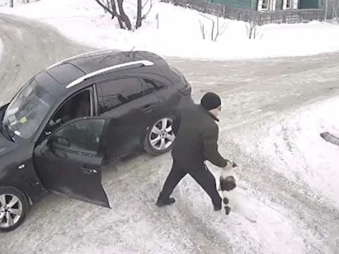 В Омске мужчина выбросил собаку из автомобиля в частном секторе и как ни в чем не бывало уехал. Видео, на котором запечатлено происходящее, поделились в телеграм-канале Mash Siberia.