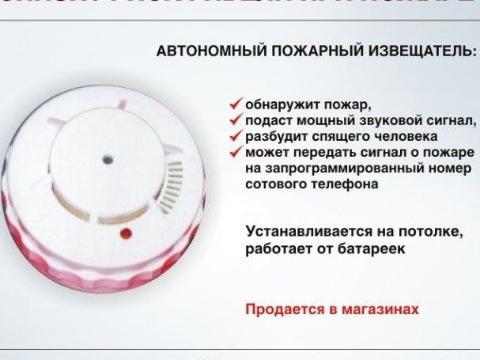 Напомним, автономный пожарный извещатель работает от собственного источника питания, не зависит от электросети и реагирует на возникновение задымления в помещении громким звуковым сигналом, который может даже разбудить спящих людей. По словам спасателей, это один из самых эффективных способов раннего предупреждения людей о пожаре в помещении.