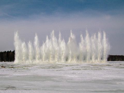 Подрыв льда осуществили в районе Кузнецкого моста. Для этого специалисты предварительно пробурили 40 лунок, в которые потом поместили заряды.