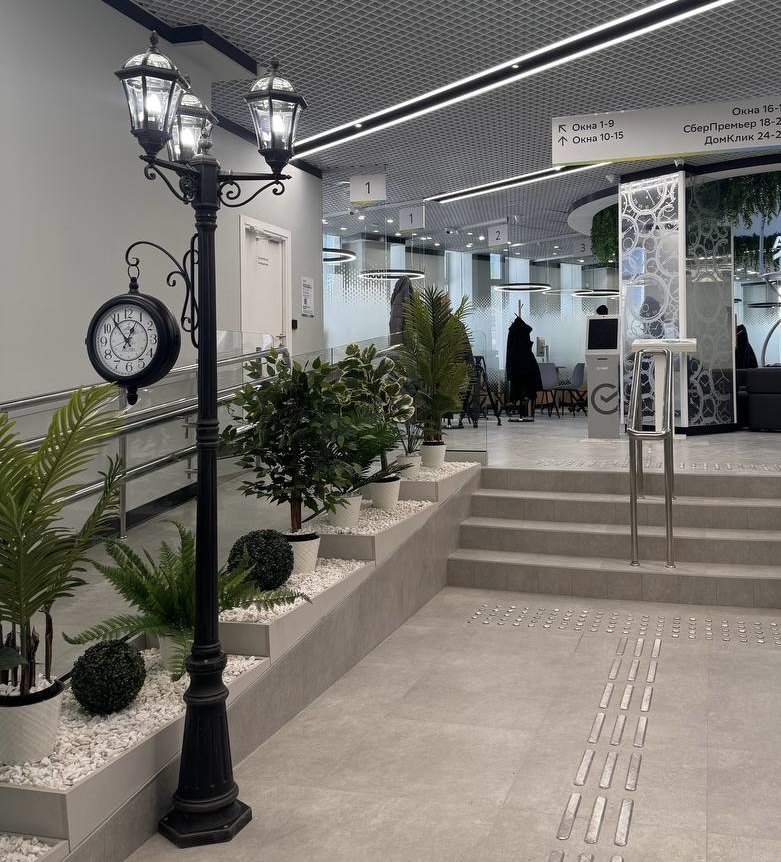В офисе оказывают услуги юридическим и физическим лицам. Есть полка со Сбердевайсами и умными устройствами Сберздоровья, а сотрудники банка консультируют и помогают разобраться в их использовании.
